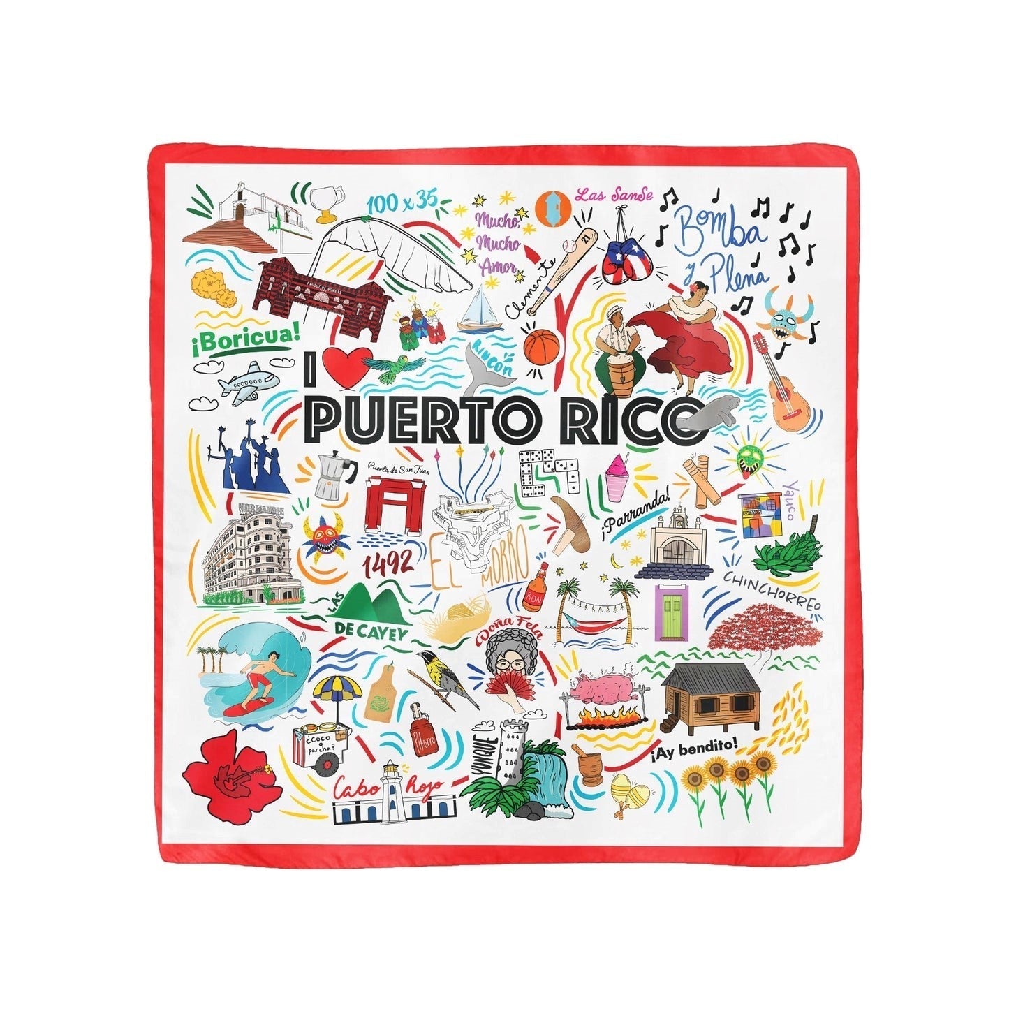 Puerto Rico icons come together into a gorgeous fashionable scarf made of soft silky fabric. Designed and made in Puerto Rico.